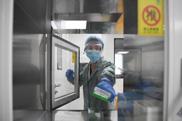 新华社照片,长沙,2020年3月10日 探访第三方核酸检测机构 3月10日,长沙卫实医学检测所的工作人员(右)将采集回来的新冠肺炎核酸检测样本传递进入前处理室。近日,位于湖南长沙经开区的长沙卫实医学检测所为长沙县的发热病人以及复工复产的企业等提供新冠肺炎核酸检测服务,日均检测样本约2500份左右,最高日检测样本达5000份。新华社记者 薛宇舸 摄