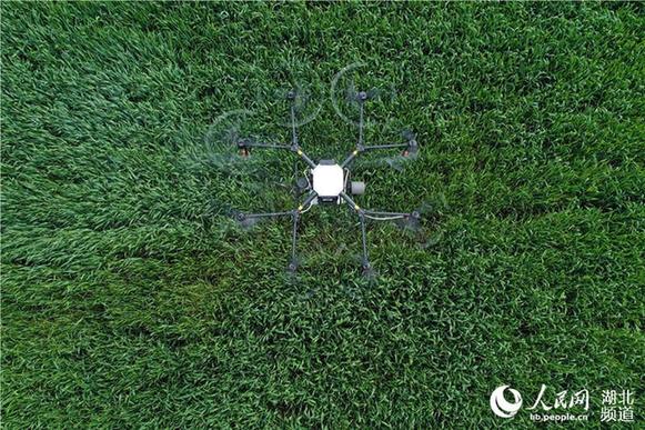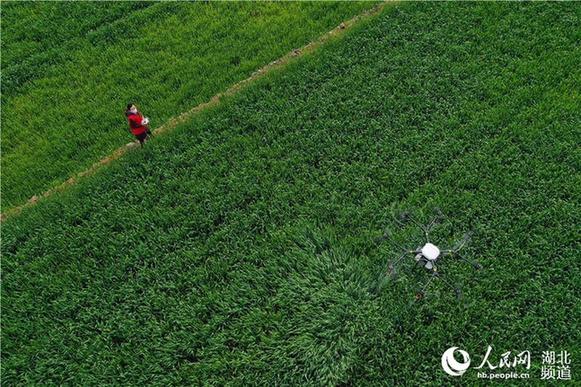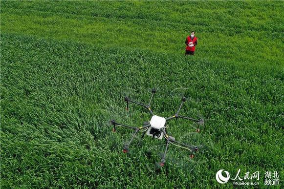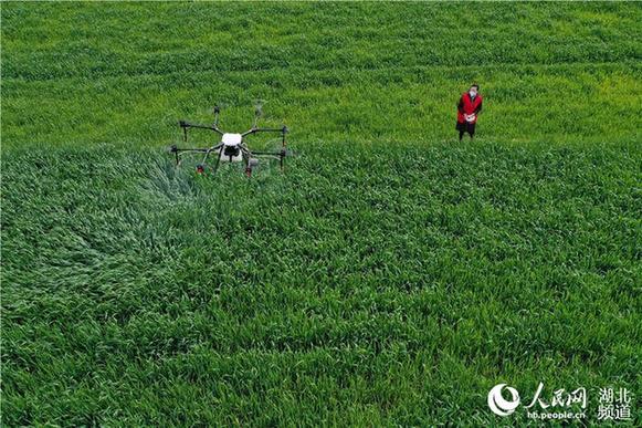 正值小麦春管时节,湖北省襄阳市??迪卦诼涫狄咔榉揽卮胧┑耐保炕筇锟萍脊芾?,利用植保无人机对小麦进行喷药作业,不误农时,为当地农民防治小麦病虫害、促进夏粮丰收打下基础。(杨韬、杨先强摄影报道)