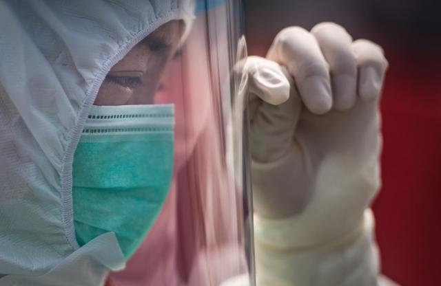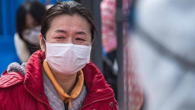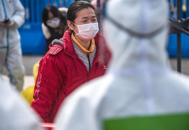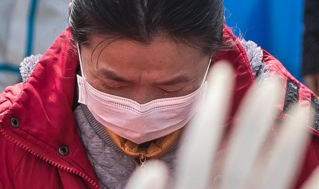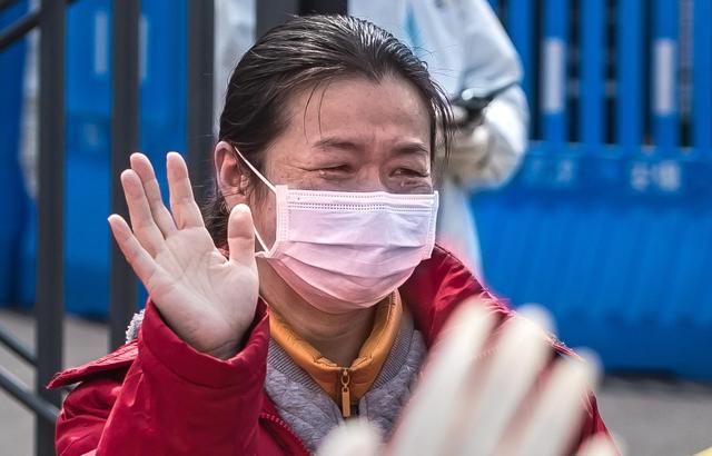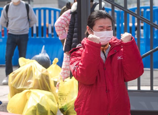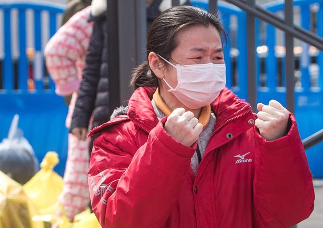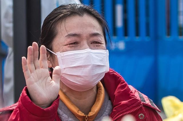 ↑3月8日,来自贵州医疗队的叶青在与一名康复的患者分别时落泪。