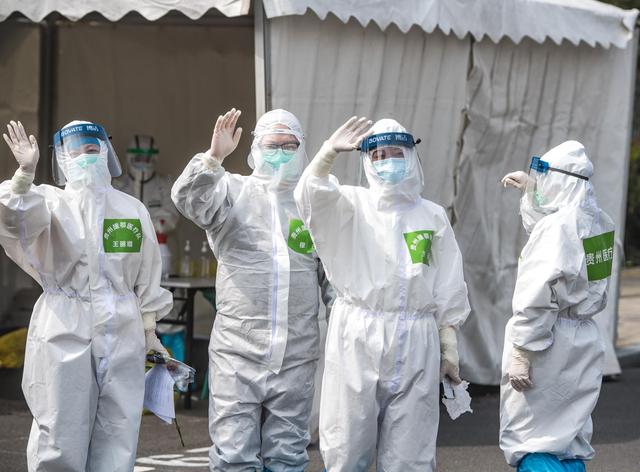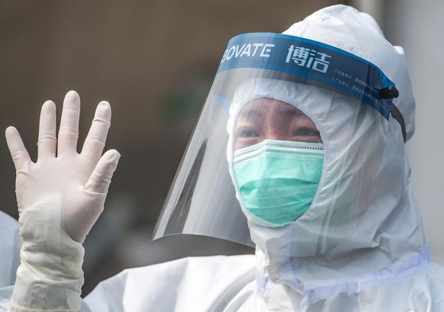 ↑3月8日,一名康复的患者在出舱后含泪与贵州医疗队的医护人员告别。