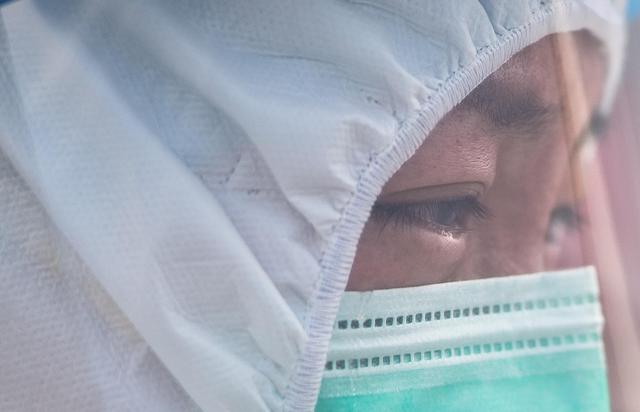 ↑3月8日,来自贵州医疗队的叶青与康复的患者分别时落泪,她试图擦拭泪水。