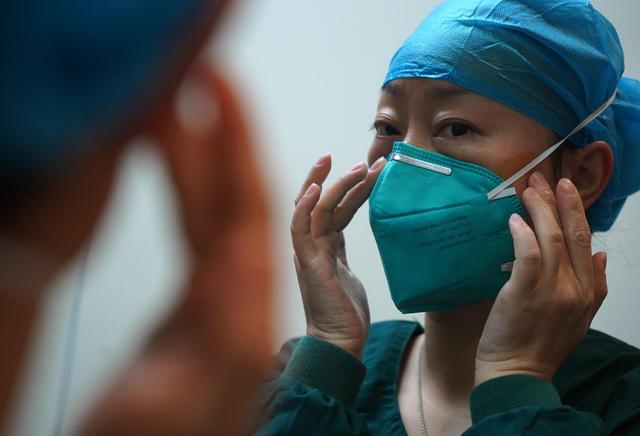 ↑南昌大学第一附属医院象湖院区重症监护室值班护士组长张筱戴口罩前在脸上贴“人工皮”,以减轻护目镜和口罩对脸部的压力(2月5日摄)。新华社记者万象 摄