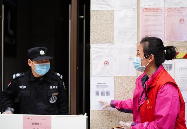↑江西省南昌市红谷滩新区沙井街道丰和社区书记徐晓琳(右)对一家写字楼的防疫工作进行检查(2月26日摄)。新华社记者 周密摄