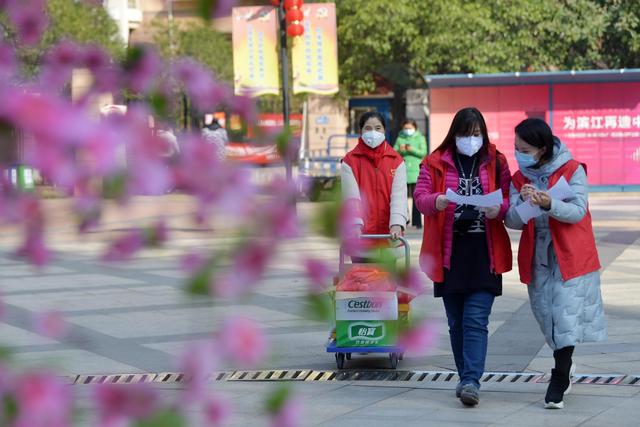 ↑江西省南昌市红谷滩新区沙井街道工作人员艾志云(右一)和同事为封闭楼栋居民分发代购物品(2月5日摄)。新华社记者 彭昭之摄