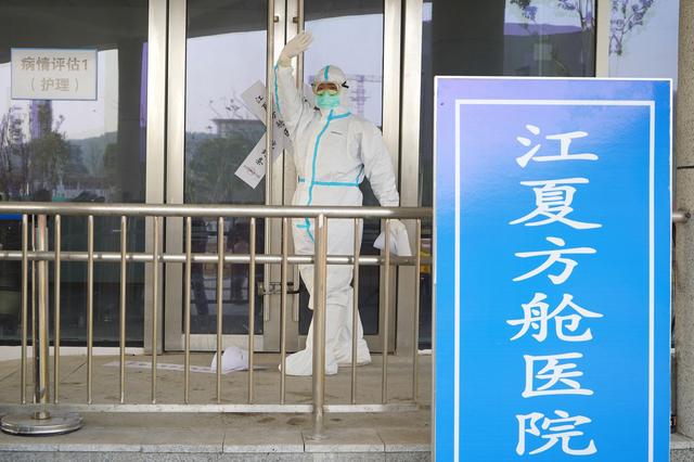 3月10日,在江夏方舱医院,一名工作人员为大门贴封条后挥手致意。