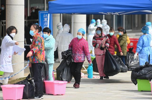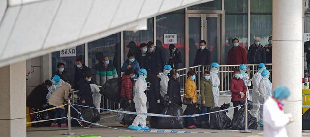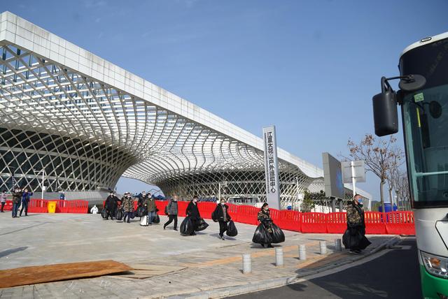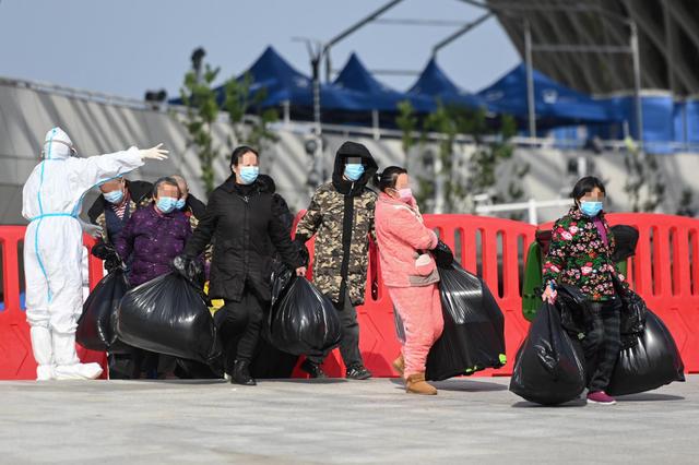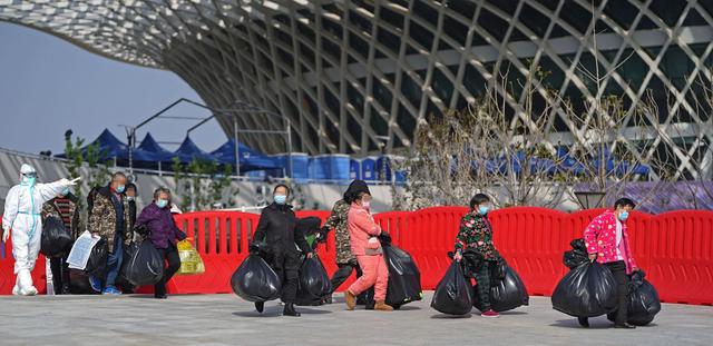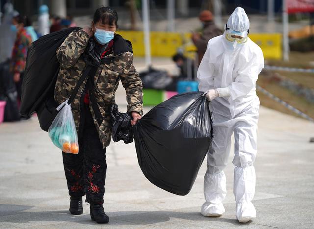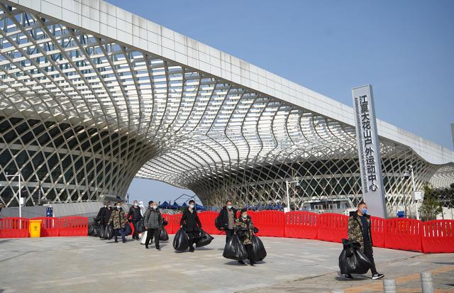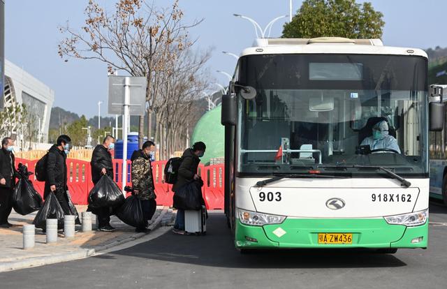 3月10日,在位于武汉市江夏大花山户外运动中心的江夏方舱医院,转院患者拿着行李准备上大巴,即将转至湖北省妇幼保健院光谷院区等医院继续治疗。