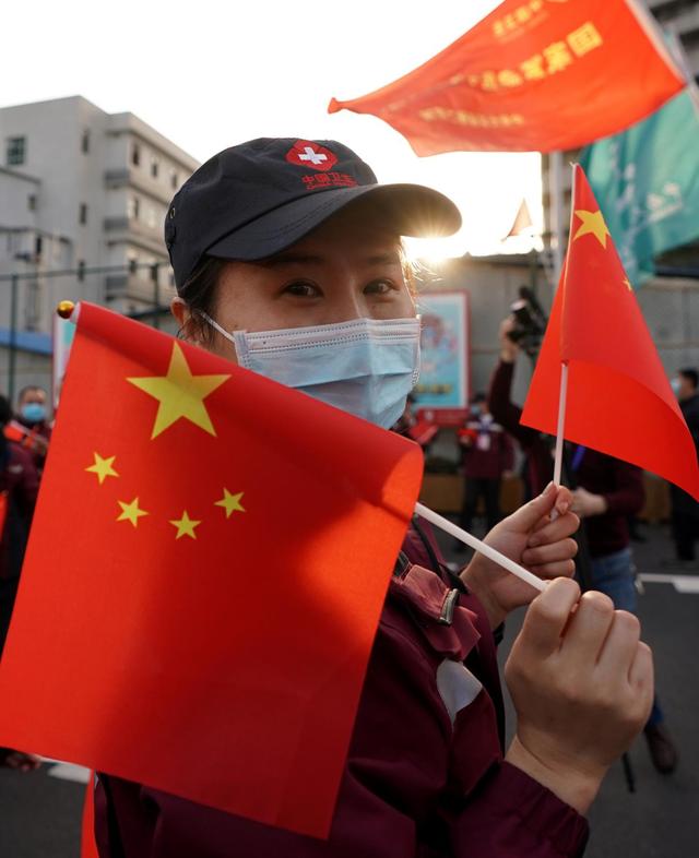 3月10日,在武汉武昌方舱医院休舱仪式后,医护人员拍照留影。