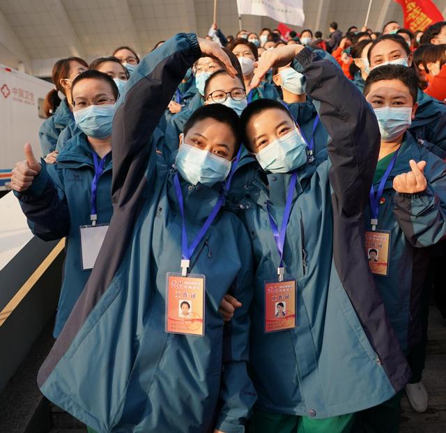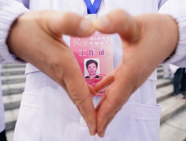 3月10日,在武汉武昌方舱医院休舱仪式后,一名医护人员在留影时做出“心”形手势。