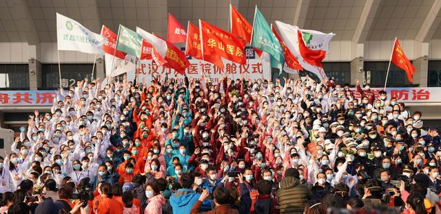3月10日,在武汉武昌方舱医院休舱仪式上,医护人员集体欢呼。