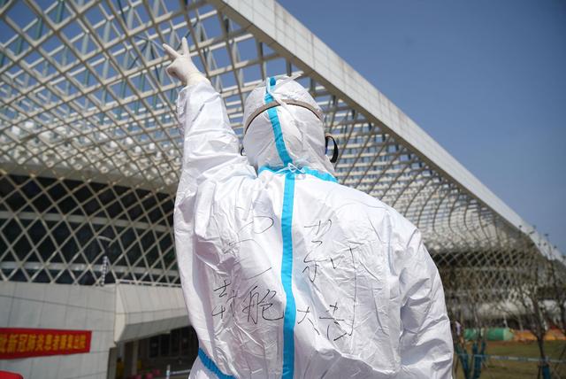 3月10日,在位于武汉市江夏大花山户外运动中心的江夏方舱医院,一名医护人员展示防护服背后的“封舱大吉”字样。