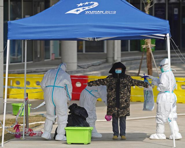 3月10日,在位于武汉市江夏大花山户外运动中心的江夏方舱医院,新冠肺炎治愈患者排队等待消毒杀菌。