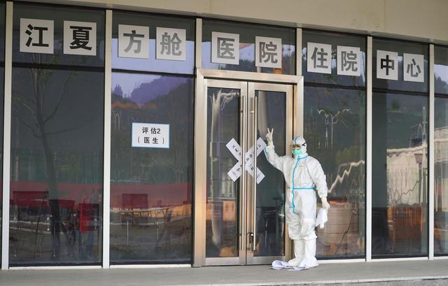 3月10日,在江夏方舱医院,一名工作人员为大门贴封条后打出胜利手势。