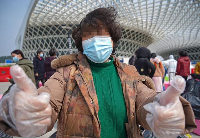 3月10日,在位于武汉市江夏大花山户外运动中心的江夏方舱医院,新冠肺炎治愈患者感谢医护人员时竖起大拇指。