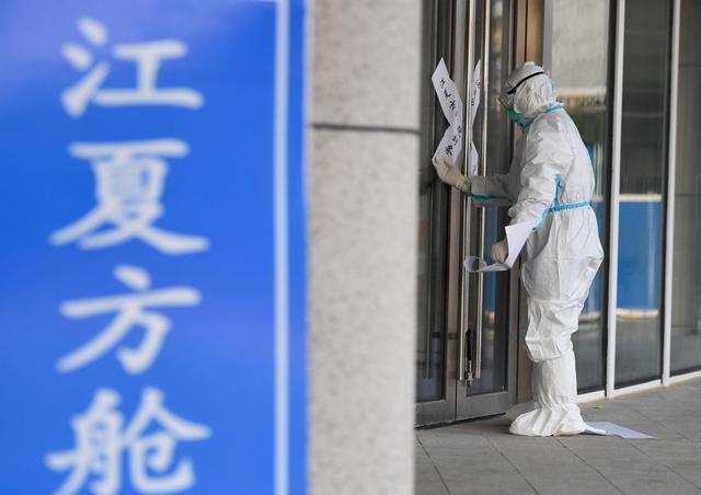 3月10日,在江夏方舱医院,一名工作人员为大门贴封条。