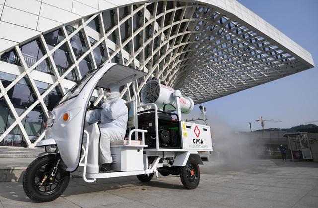 3月10日,工作人员对江夏方舱医院外围进行消杀作业。