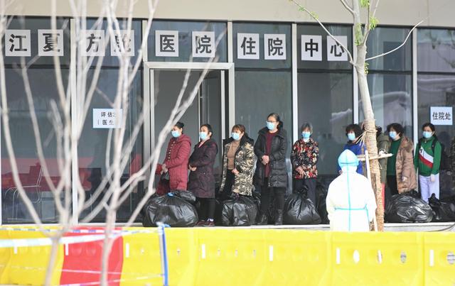 3月10日,江夏方舱医院新冠肺炎治愈患者排队等候出舱。