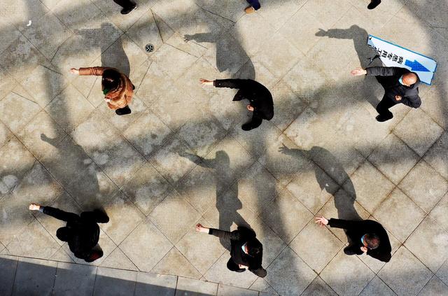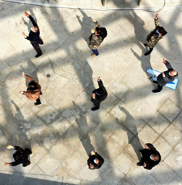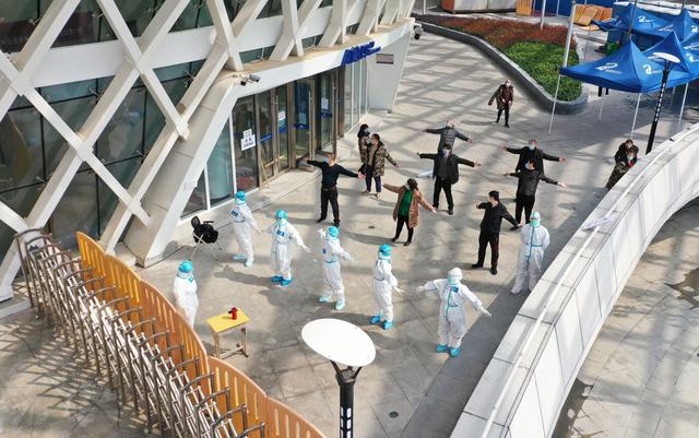 3月10日,在江夏方舱医院,即将出舱的新冠肺炎治愈患者在练习八段锦(无人机照片)。