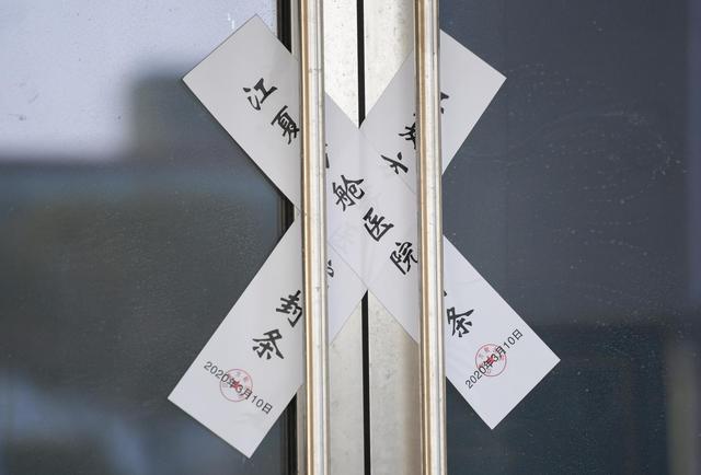 3月10日,在位于武汉市江夏大花山户外运动中心的江夏方舱医院,一名工作人员为大门贴封条。