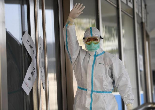 3月10日,江夏方舱医院一位新冠肺炎治愈患者与医护人员道别。
