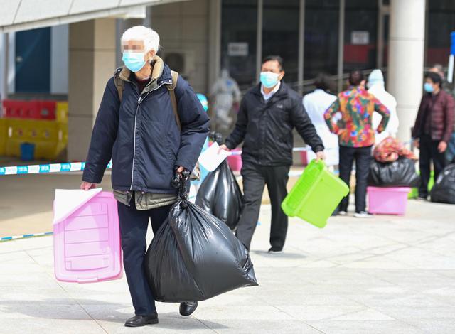 3月10日,在位于武汉市江夏大花山户外运动中心的江夏方舱医院,医护人员帮助新冠肺炎治愈患者(中)拿行李。