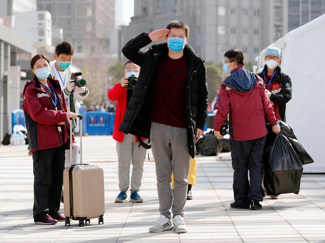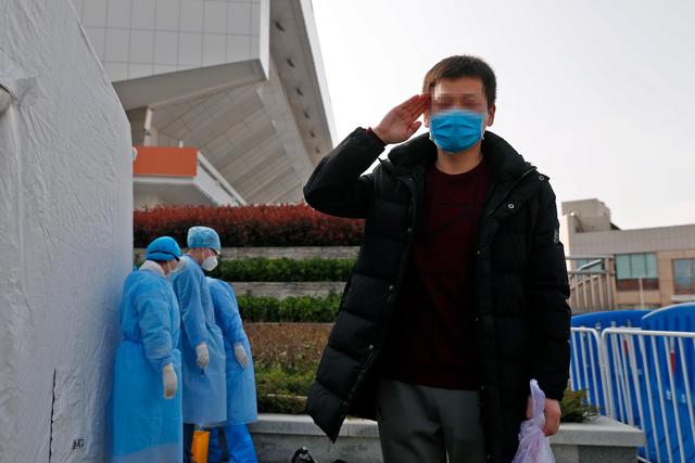 新华社照片,武汉,2020年3月10日 武昌方舱医院最后一批痊愈病人出舱 3月10日,上海复旦大学附属华山医院认定的最后一名痊愈出舱病人(前)走出武昌方舱医院时回身向送他的医护人员敬礼。当日,武昌方舱医院最后一批痊愈病人共49人出舱。 新华社记者 沈伯韩 摄