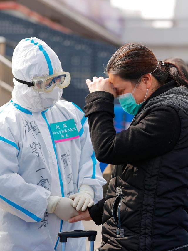 新华社照片,武汉,2020年3月10日 武昌方舱医院最后一批痊愈病人出舱 3月10日,在武昌方舱医院病区出口,中南大学湘雅二医院的刘亚(左)握着一名即将出舱、激动落泪的新冠肺炎治愈患者的手。刘亚的防护服上写着“湘鄂一家亲”的字样。当日,武昌方舱医院最后一批痊愈病人共49人出舱。 新华社记者 沈伯韩 摄