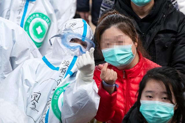 新华社照片,武汉,2020年3月10日 武昌方舱医院最后一批痊愈病人出舱 3月10日,在武昌方舱医院,一名医务人员与一名即将出舱的新冠肺炎治愈患者一起比心。 当日,武昌方舱医院最后一批痊愈病人共49人出舱。新华社记者 沈伯韩 摄
