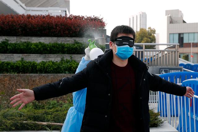 新华社照片,武汉,2020年3月10日 武昌方舱医院最后一批痊愈病人出舱 3月10日,上海复旦大学附属华山医院认定的最后一名痊愈出舱病人跨过武昌方舱医院病区出口后,接受医务人员为其消毒。当日,武昌方舱医院最后一批痊愈病人共49人出舱。 新华社记者 沈伯韩 摄