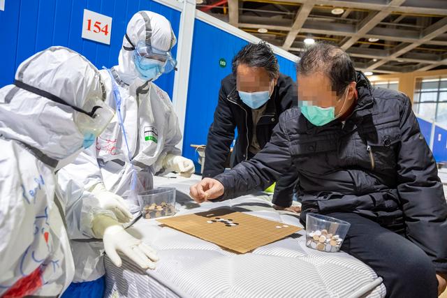 新华社照片,武汉,2020年3月10日 武昌方舱医院最后一批痊愈病人出舱 3月10日,在武昌方舱医院,即将出舱的新冠肺炎治愈患者(右一)与在此工作的青海援助湖北医疗队队员马振华(左二)用江西援助湖北医疗队队员自制的棋盘和棋子下五子棋。当日,武昌方舱医院最后一批痊愈病人共49人出舱。 新华社记者 沈伯韩 摄