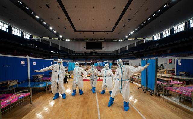 新华社照片,武汉,2020年3月10日 最后的方舱记忆 3月10日,在武昌方舱医院,新冠肺炎治愈患者出舱后,河北医疗队队员在方舱内跳舞庆祝。 当日,武昌方舱医院最后一批痊愈病人共49人出舱。新华社记者 费茂华 摄