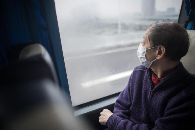 3月12日,一名解除隔离的治愈患者眺望车窗外。