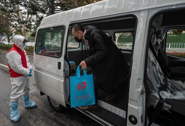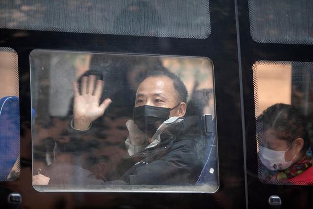 3月12日,陈志在离开武汉软件工程职业学院康复驿站时向照顾自己的工作人员挥手作别。