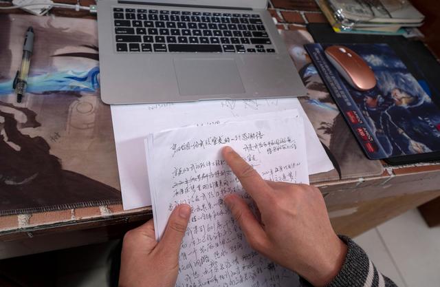 3月11日,陈志在武汉软件工程职业学院康复驿站的学生宿舍里整理自己写给宿舍“室友”的感谢信。陈志说自己在这里住了十四天,好像重新回到了大学时代。