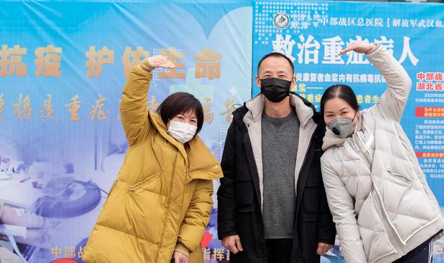 3月12日,陈志(中)和一起来献血的两位病友在位于中国人民解放军中部战区总医院的献血车旁合影。