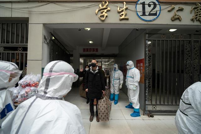 3月12日,陈志(中)提着行李走出武汉软件工程职业学院康复驿站的学生宿舍。