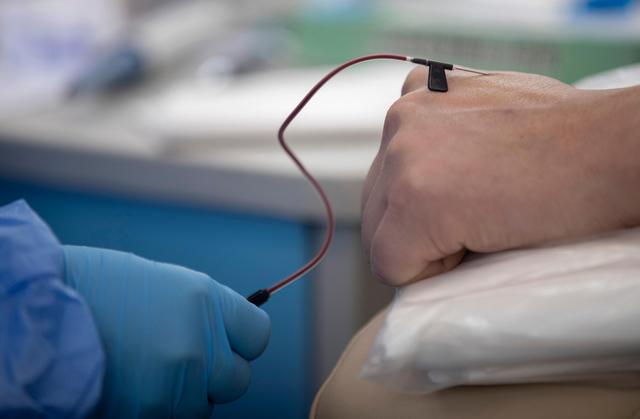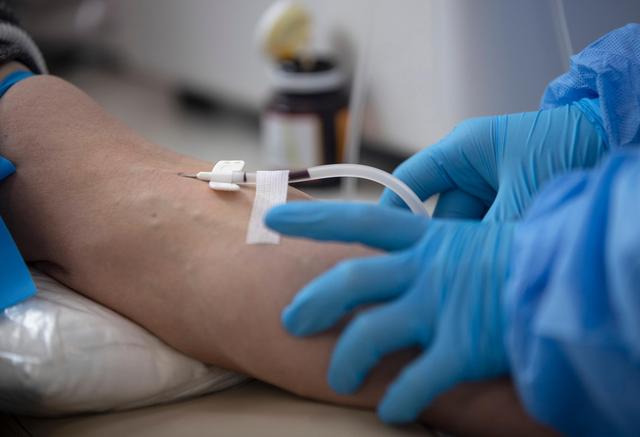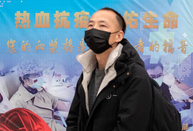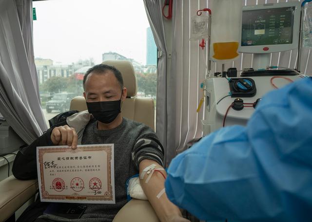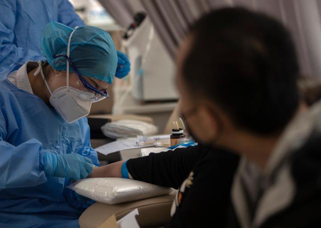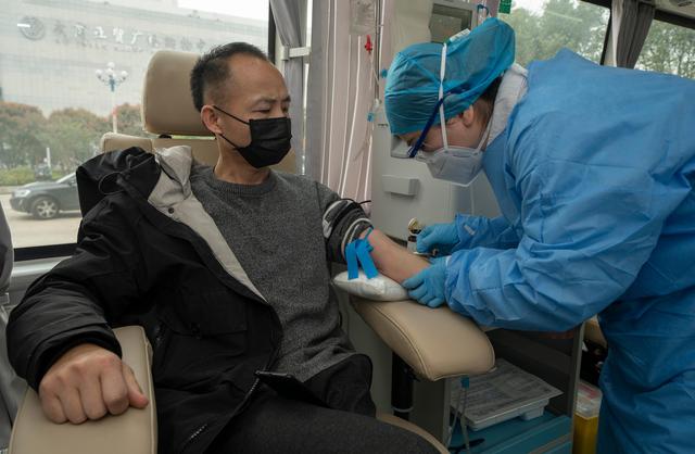 3月12日,在位于中国人民解放军中部战区总医院的献血车里,工作人员在采集陈志的血样。