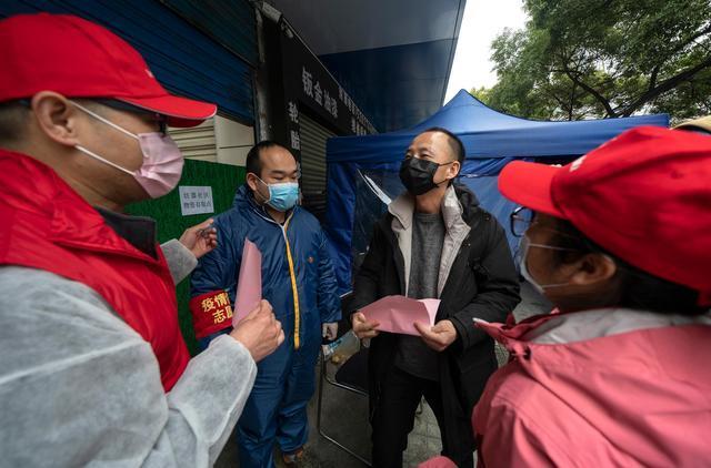 3月12日,献血结束后,陈志(右二)乘车回到自己家所在的小区,受到社区工作人员的欢迎。