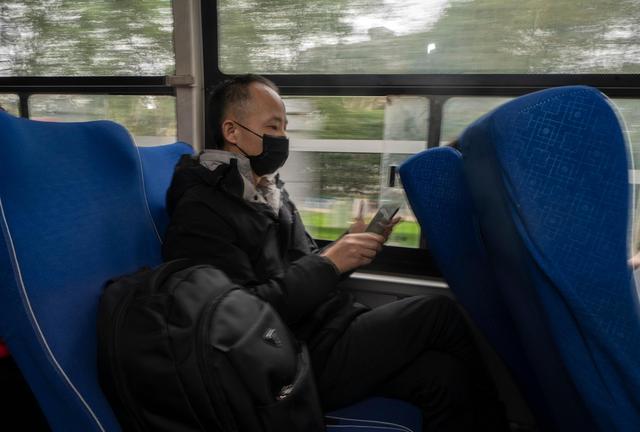 3月12日,坐在前往集散点的大巴车上,陈志与家人用手机聊天。