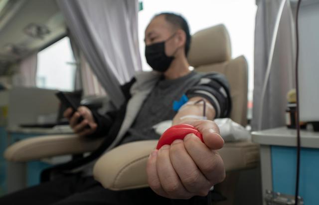 3月12日,在位于中国人民解放军中部战区总医院的献血车里,陈志在献血。