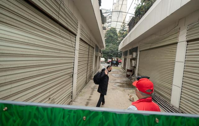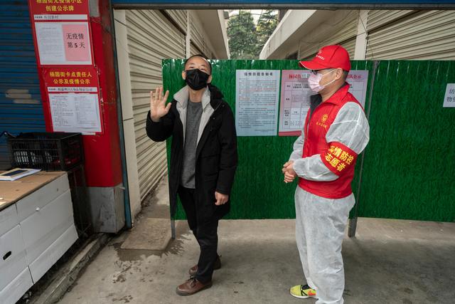 3月12日,陈志(左)进入居住的小区时,与社区工作人员挥手告别。