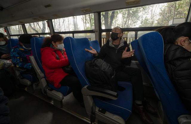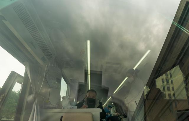 3月12日,坐在前往集散点的大巴车上,陈志(右二)告诫病友们:“即使到家也不能乱跑,还要在家里居家隔离14天”。