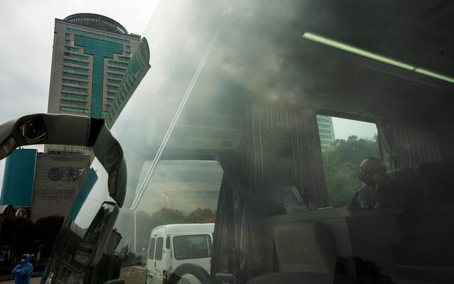 3月12日,在位于中国人民解放军中部战区总医院的献血车里,陈志在打电话。
