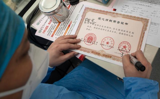 3月12日,在位于中国人民解放军中部战区总医院的献血车里,工作人员在填写陈志的献血荣誉证书。