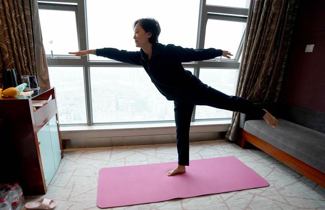 3月12日,火神山医院感染三科一病区护士郭玮在做瑜伽。当日,记者走进武汉火神山医院感染三科一病区护士的驻地,探访她们的业余生活。新华社记者王毓国摄影报道