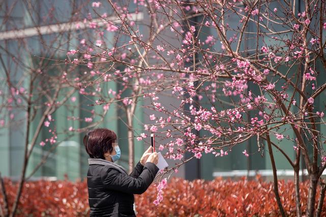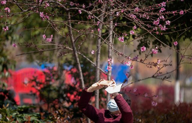 ↑3月14日,在华中科技大学同济医学院附属同济医院光谷院区,一名等待去做检查的新冠肺炎患者欣赏盛开的桃花。