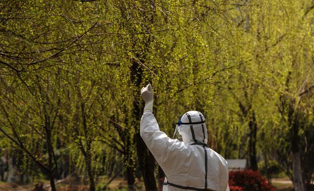 ↑3月14日,在华中科技大学同济医学院附属同济医院光谷院区,一位医护人员伸手触摸刚刚发芽的柳枝。