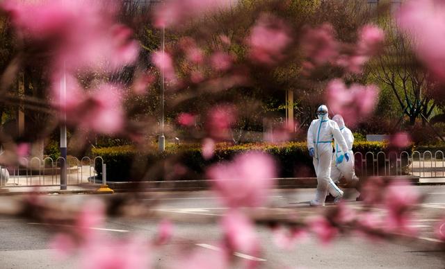 ↑3月14日,在华中科技大学同济医学院附属同济医院光谷院区,两名医护人员从盛开的桃花旁走过。
