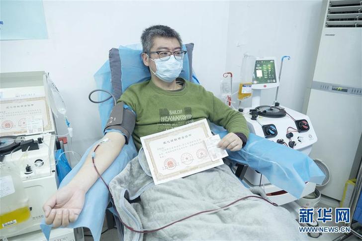3月16日,在武汉市血液中心,新冠肺炎康复者周先生在献血浆。在抗击新冠肺炎疫情期间,一些新冠肺炎康复者在愈后自愿无偿捐献血浆,让一份份爱心凝聚成战胜疫情的强大动力。 新华社记者 才扬 摄