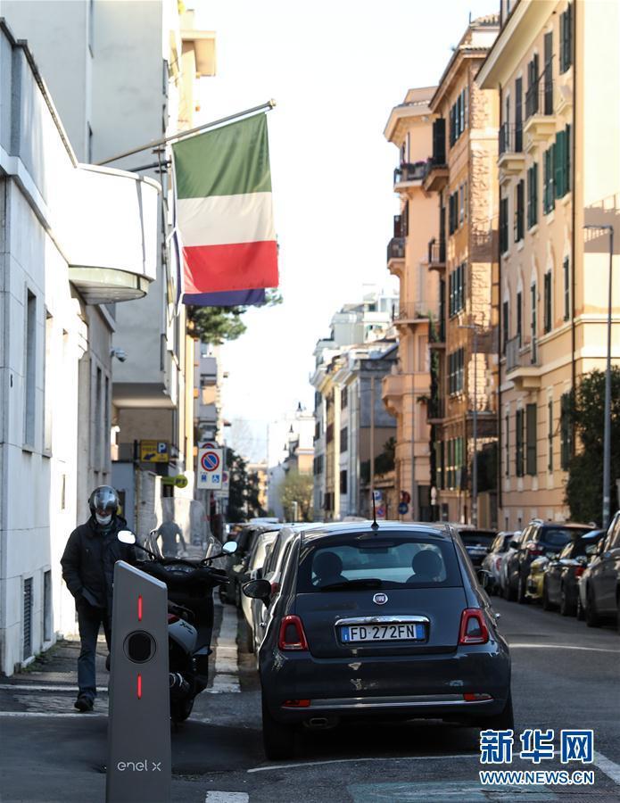 3月15日,在意大利首都罗马,一名男子戴着口罩出行。新华社记者程婷婷 摄
