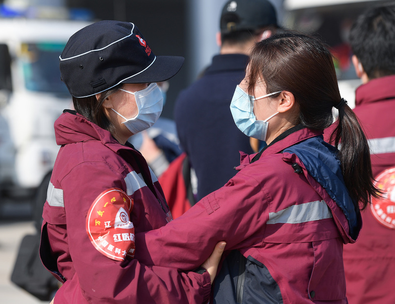 3月17日,离鄂的部分国家紧急医学救援队在武汉东西湖方舱医院集结并启动撤离。在撤离仪式现场,两位已经“熟识”的抗疫姐妹并不知道对方已经留下来继续工作。直到相见一刻才确认彼此都不在撤离的名单里,她们双双留下来继续从事重病患者的护理救治任务。